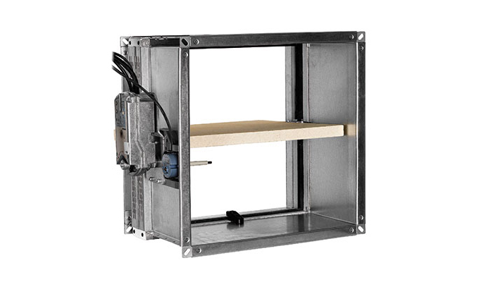 Rectangular fire damper for air duct system that penetrate fire resistance walls or floors. With 25 mm thick closing blade made from refractory material. Casing leakage performance class C according to Standard EN1751:2014 section C.3.