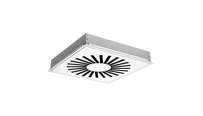 RS15 is a square swirl diffuser with adjustable bars that can be used for both supply and exhaust air. The swirl pattern ensures high induction and a large dynamic range. It is therefore ideal for the horizontal supply of very cold air. The diffuser can also be set to a vertical supply air pattern, enabling supply of heated air. The diffuser is supplied as standard with inward swirl. For exhaust, the diffuser is supplied as standard without bars