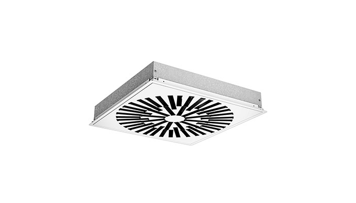 RS16 is a square swirl diffuser with adjustable bars that can be used for both supply air and exhaust. The swirl pattern ensures high induction and a large dynamic range, and is therefore ideal for the horizontal supply of very cold air. For exhaust, the diffuser is supplied as standard without bars.
