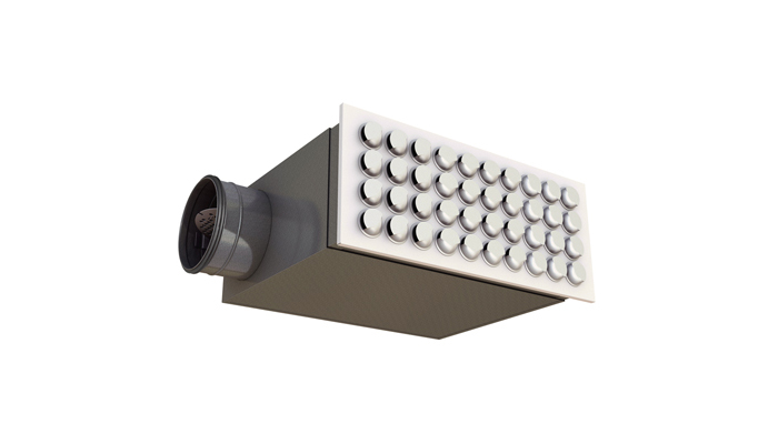 NR19 is a rectangular diffuser with adjustable nozzles suitable for installation in a wall or skirting board. The diffuser is suitable for the horizontal supply of cooled air. The nozzles at the front make it possible to vary the dispersal pattern and thereby create different throws. The diffuser is used with a WB type plenum box. The plenum boxes are equipped with a damper and measuring device, enabling individual adjustment.