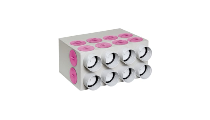 The presence of the new built-in threaded caps , made of eco-friendly magenta-coloured plastic, allows you to vary the position and number of connections by simply exchanging the caps themselves.