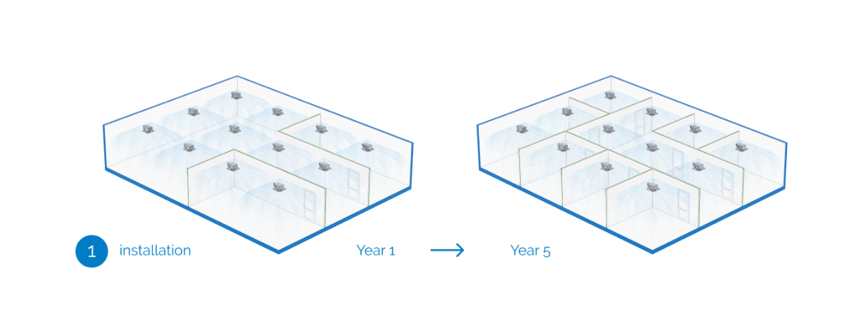 When new demands occur, you can easily change the design without having extra installation costs. You don’t have to mind sensors, duct-work or room controllers when redesigning your office environment.