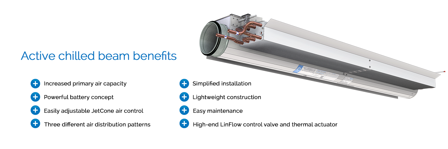 Since water carries significantly more energy than air, active chilled beams require much less energy to provide the same heating and cooling effect as a traditional heating, ventilation and air conditioning system (HVAC). Compared to traditional HVAC systems, the chilled beam system is also almost noiseless and requires little or no maintenance, resulting in a more enjoyable indoor climate and lower life time costs