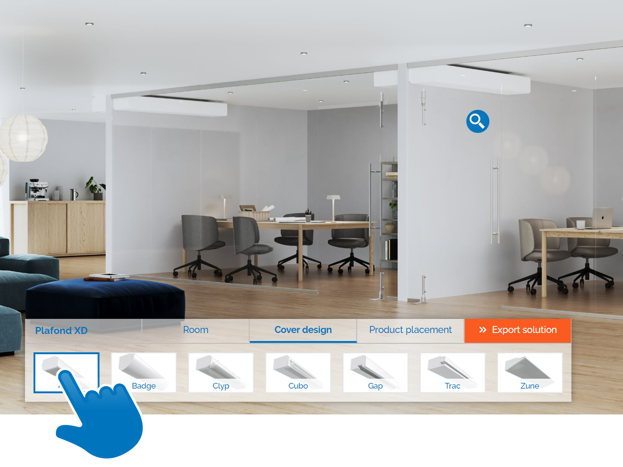 With so many options to choose from in terms of where the Plafond XD can be placed and how the seven unique design covers can be fitted into various rooms with different interior design styles, there is simply no better way to present the Plafond XD covers than with an interactive display. With this tool we aim to inspire and set new standards for ventilation as part of the interior. Remember to export your solution when you have found what satisfies your needs and feel free to reach out for more information and calculations.