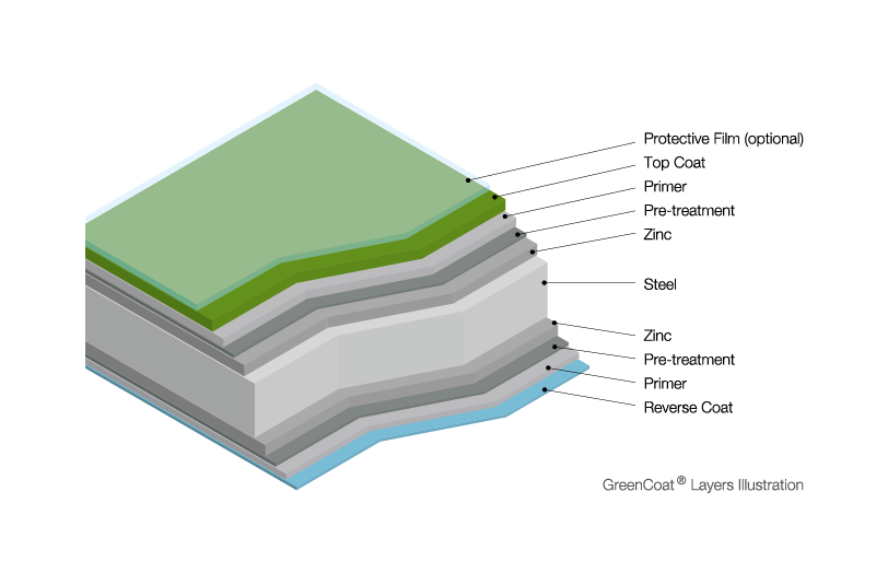 The base material in colour coated steel consists of steel, coated with a thin zinc layer. The zinc coating protects the steel from corrosion in two ways. It is a protective layer keeping oxygen and water away from the steel, but it also acts as a cathodic protection. The pre-treatment layer is applied to further improve the corrosion resistance, but also to give a good adhesion to the coating layer. The primer layer is used for corrosion protection with corrosion protective additives and also acts to give a good adhesion to the top coat.